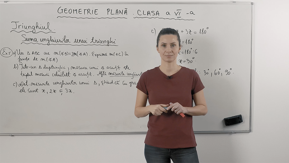 Calculul unghiurilor și relațiile dintre unghiuri într-un triunghi sunt prezentate pas cu pas în lecția video despre suma unghiurilor și exprimarea măsurii unui unghi în funcție de un altul. Elevii vor afla cum să formuleze ecuații simple pentru a determina măsuri de unghiuri și să aplice teoria în exemple practice.