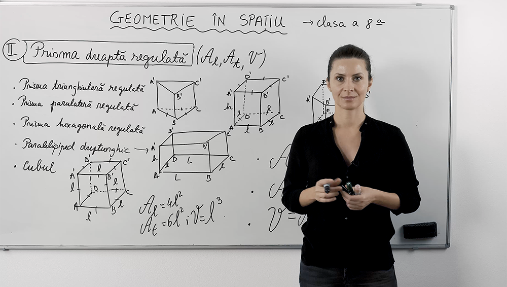 Prisma triunghiulară, patrulateră sau hexagonală – afli cum se calculează aria laterală, aria totală și volumul prismelor regulate. Lecția video explică de la A la Z: perimetrul bazei ori înălțimea pentru aria laterală, apoi adunarea celor două baze pentru aria totală și înmulțirea ariei bazei cu înălțimea pentru volum. Exemple pas cu pas și desenele clar te ajută să aplici formulele cu ușurință și să rezolvi orice problemă de geometrie în spațiu.