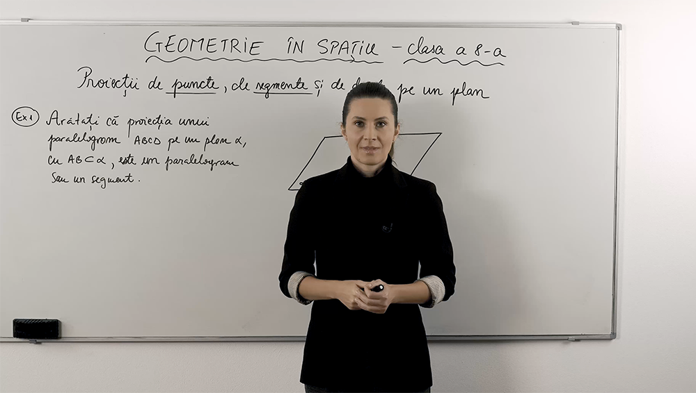 Află cum se proiectează un paralelogram pe un plan și de ce “umbra” sa poate fi fie un paralelogram, fie un segment. Lecția video explică cum proiectezi fiecare vârf și cum stabilești coliniaritatea punctelor proiectate. Vei vedea de ce laturile proiectate rămân paralele cu cele inițiale.