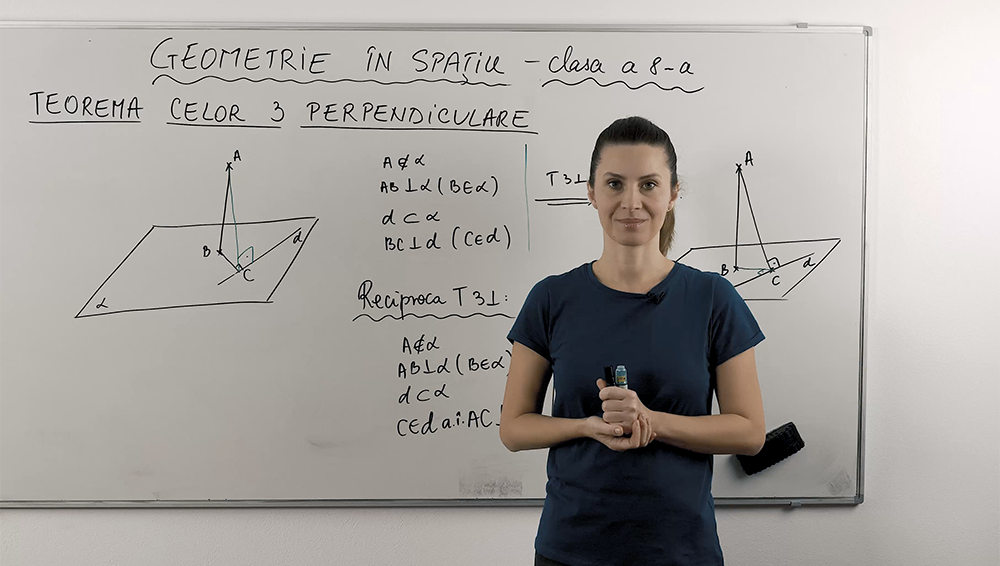 În această lecție aprofundezi teorema celor trei perpendiculare și reciproca ei, învățând cum să demonstrezi că o dreaptă este perpendiculară pe o dreaptă conținută într-un plan. Exemplele practice și demonstrațiile clare îți arată pașii pentru a aplica rapid și corect condițiile teoremei în rezolvarea problemelor de geometrie în spațiu.