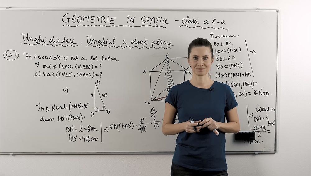Noțiunile de unghi diedru (unghiul dintre două plane date) sunt explicate pas cu pas prin teorema celor trei perpendiculare și proprietăți de geometrie plană. Vei învăța cum să identifici dreapta de intersecție a celor două plane, să construiești perpendicularele pe ea și să calculezi rapid unghiul de 45° sau 90° aplicând raționamente geometrice simple și clare.