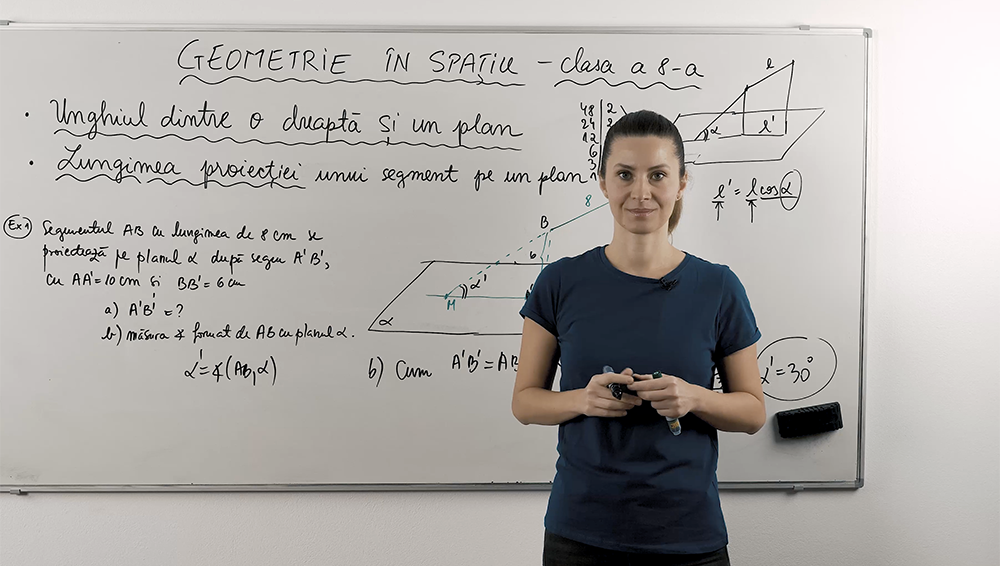 Proiecția pe plan și unghiul între dreaptă și plan explicate simplu: înveți cum să determini măsura unghiului dintre o dreaptă și un plan şi lungimea proiecției unui segment pe plan. Lecția include pași detaliați și un exemplu rezolvat pas cu pas, astfel încât să înțelegi clar cum se construiește proiecția și cum aplici teorema lui Pitagora într-un trapez dreptunghic. Vei descoperi rapid cum se proiectează segmentele şi cum se calculează unghiurile folosind proiecții.
