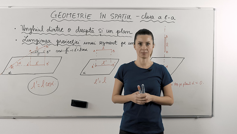 Descoperă cum se măsoară unghiul dintre o dreaptă și un plan şi cum calculezi lungimea proiecției acesteia pe plan. Lecția video arată că unghiul este determinat de dreaptă şi proiecție, iar lungimea acesteia se obține înmulțind lungimea segmentului cu cosinusul unghiului.