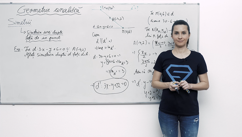 Simetria unei drepte faţă de un punct explorează conceptul de drepte paralele şi simetrie a unui punct față de un altul. Lecţia video arată cum alegi un punct de referinţă pe dreapta dată, îi afli simetricul față de punctul din enunț şi obţii coordonatele unui nou punct. Apoi calculezi panta (dreptele paralele au pante egale) și închei prin a scrie ecuaţia dreptei simetrice. Prezentarea clară şi exemplele detaliate îţi permit să vezi rapid paşii necesari pentru a stăpâni acest tip de problemă de geometrie analitică, consolidându-ţi înţelegerea.