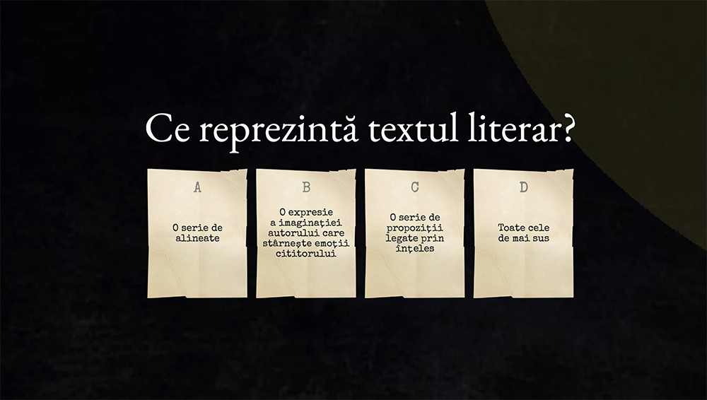 "Răspunde la întrebări despre textul literar și descoperă cum propozițiile formează o poveste. Prin jocuri amuzante afli cine este autorul, câte alineate are un text și ce înseamnă un text scris. Vei învăța cum să identifici ideile importante într-un mod distractiv și captivant."